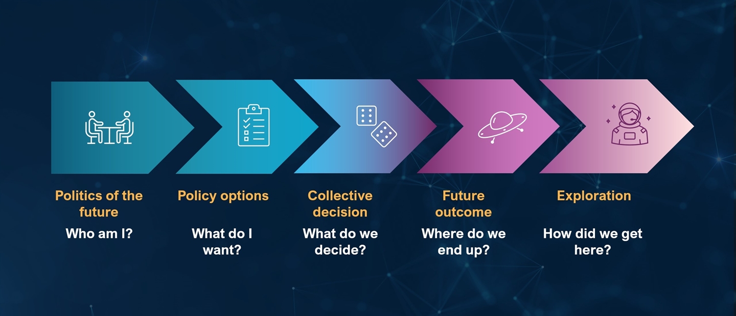To make the future even more tangible, games can be highly effective. In a serious game, participants step into someone else’s role and explore what a possible future might mean for them in a playful setting. For example, in a project on online platforms, participants took on the role of future political parties negotiating policies, within the simple guidance framework shown below. A competitive atmosphere quickly emerged, with everyone trying to achieve the most favourable scenario for ‘their’ party. This kind of approach is not only engaging but also helps people to genuinely immerse themselves in alternative worlds and unexpected outcomes.