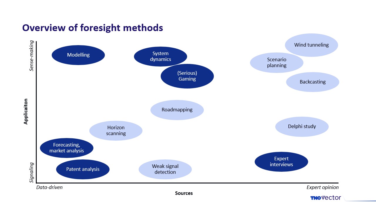 Foresight is a way to systematically explore several possible futures. There are many methods for doing so, each with its own advantages and drawbacks. Some methods (light blue in the overview) are specifically designed for foresight, but methods from other disciplines are also frequently applied in foresight (see the dark blue examples).