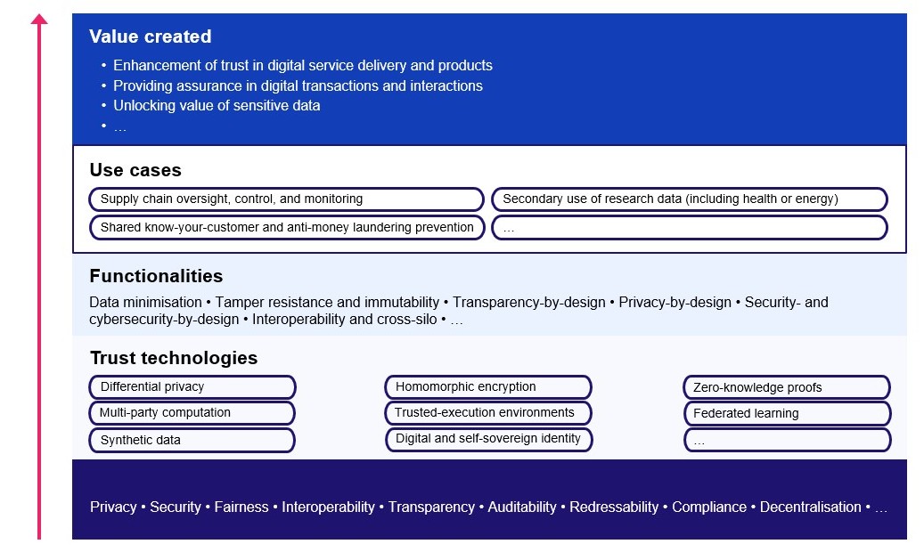 Technologies such as privacy‑enhancing technologies, digital identities and zero‑knowledge proofs play a crucial enabling role for Digital Trust. When combined with robust governance, they enable secure and scalable collaboration in sensitive domains such as healthcare, finance and government. Therefore we developed a visual representation of these trust technologies (or ‘trust tech’ for short) – including requirements that derive their use and possible advantages.