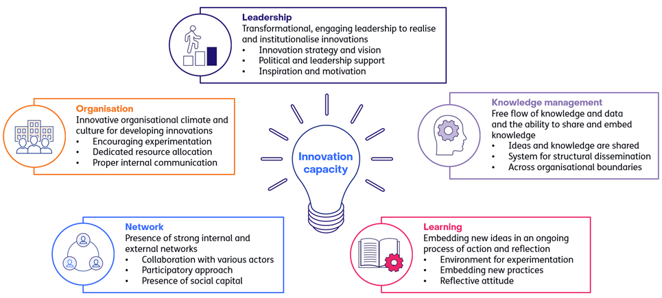 Innovation capacity concerns an organisation’s ability to structurally renew, experiment and adopt new ways of working. TNO defines five elements: