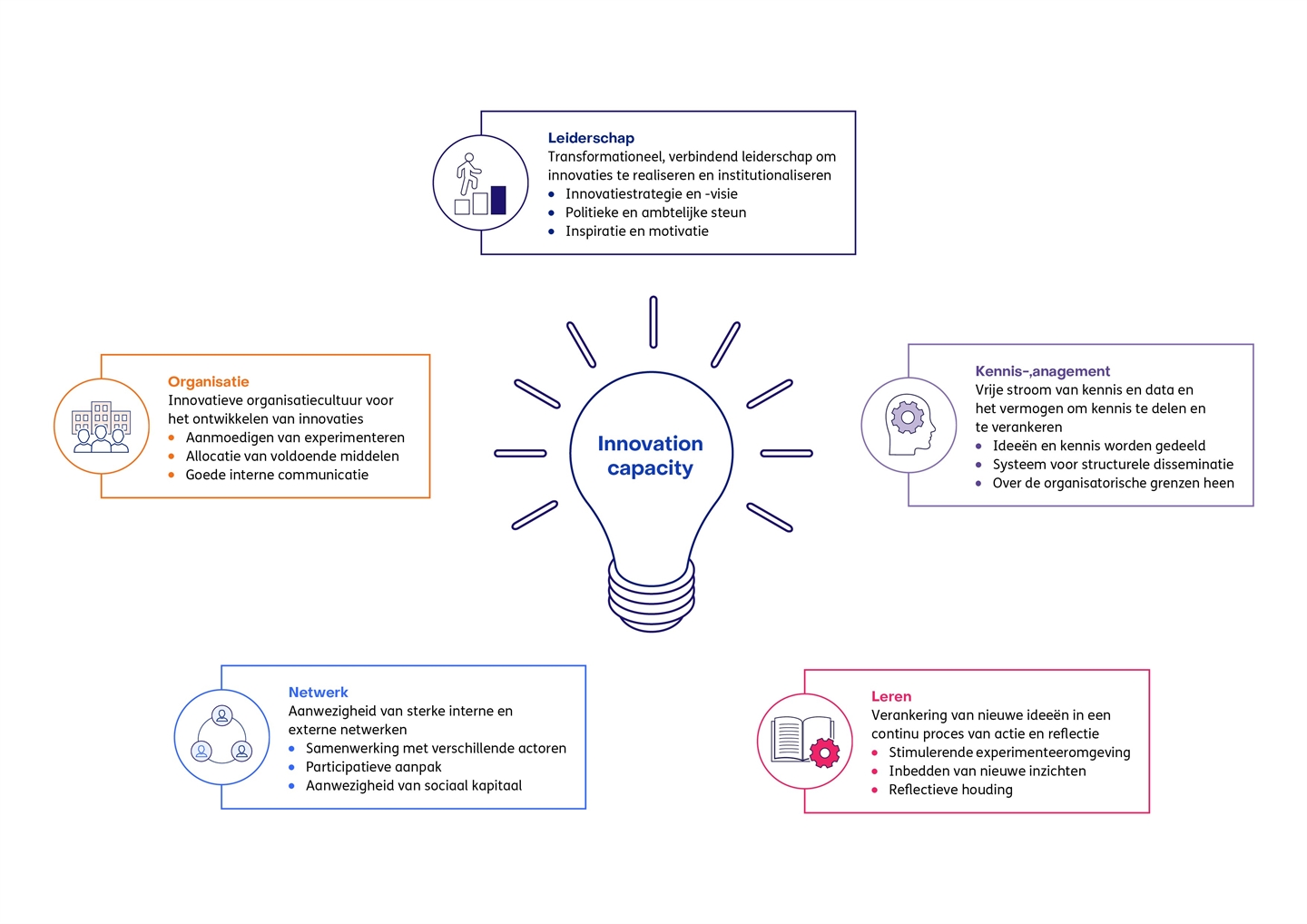 We definiëren innovatiecapaciteit als het geheel aan competenties en condities die innovatie binnen publieke organisaties mogelijk maken en ondersteunen. Dit benaderen we aan de hand van een raamwerk bestaande uit vijf elementen: